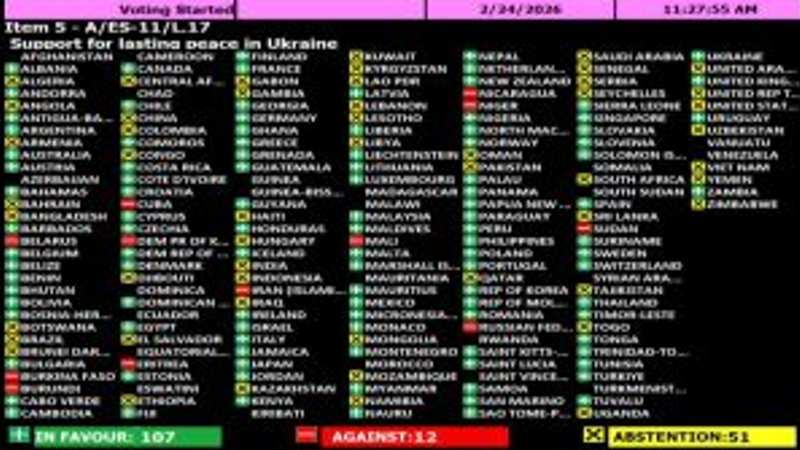 Ռուսաստանի կողմից Ուկրաինա լայնածավալ ներխուժման չորրորդ տարելիցի առթիվ ՄԱԿ-ի Գլխավոր ասամբլեան ընդունել է «Աջակցություն Ուկրաինայում երկարատև խաղաղությանը» վերնագրով բանաձև, գրում է DW-ի ռուսական ծառայությունը: Փետրվարի 24-ին Նյու Յորքում կայացած հանդիպման ժամանակ 107 երկրների ներկայացուցիչներ քվեարկել են փաստաթղթի օգտին, որը հաստատում է Ուկրաինայի «ինքնիշխանության, անկախության, միասնության և տարածքային ամբողջականության իրավունքը իր միջազգայնորեն ճանաչված սահմանների շրջանակներում»: Բանաձևին …